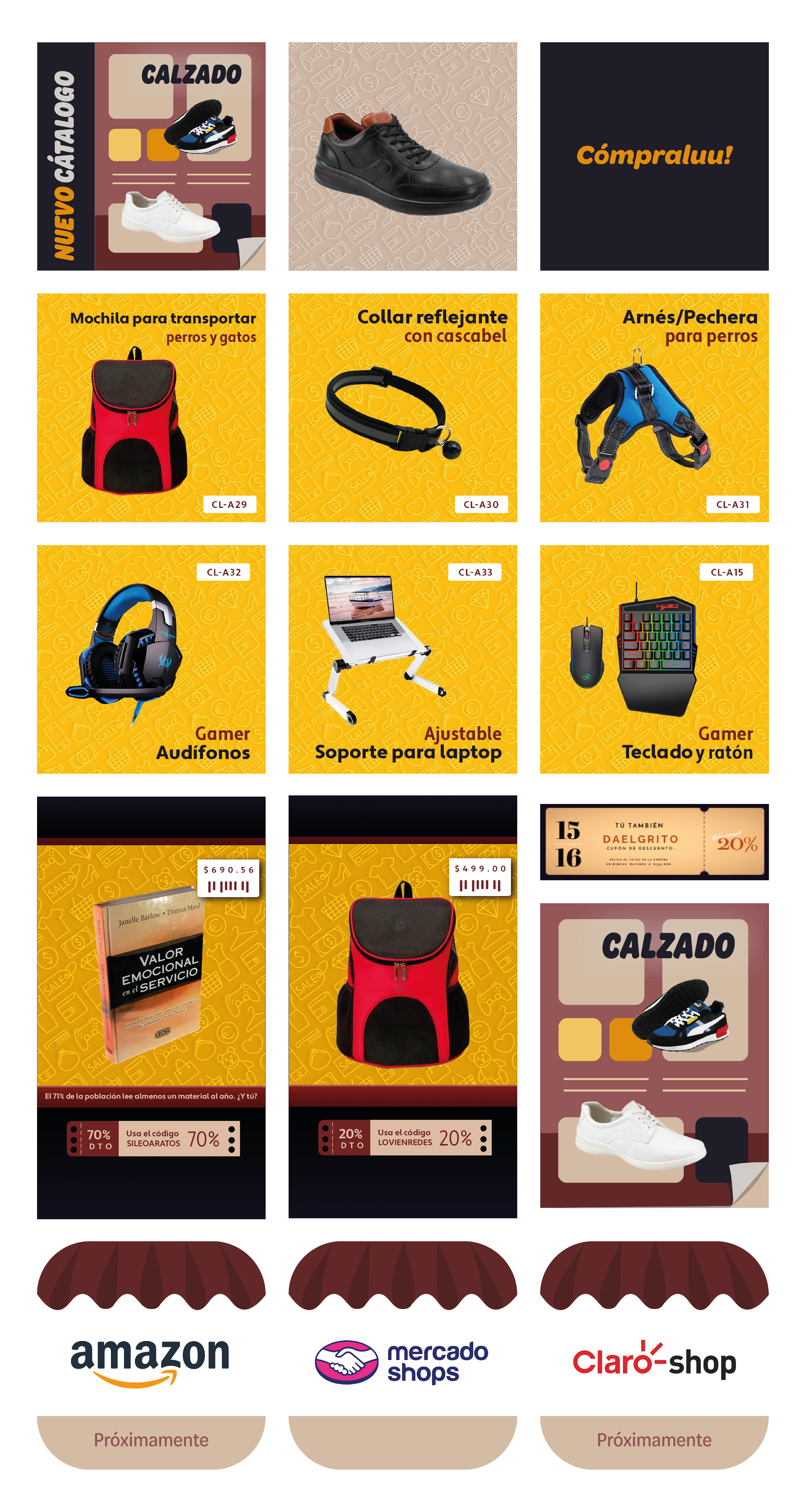 Conjunto de piezas gráficas para promocionar productos de la tienda en línea Cómpraluu! a través de su página web y redes sociales.